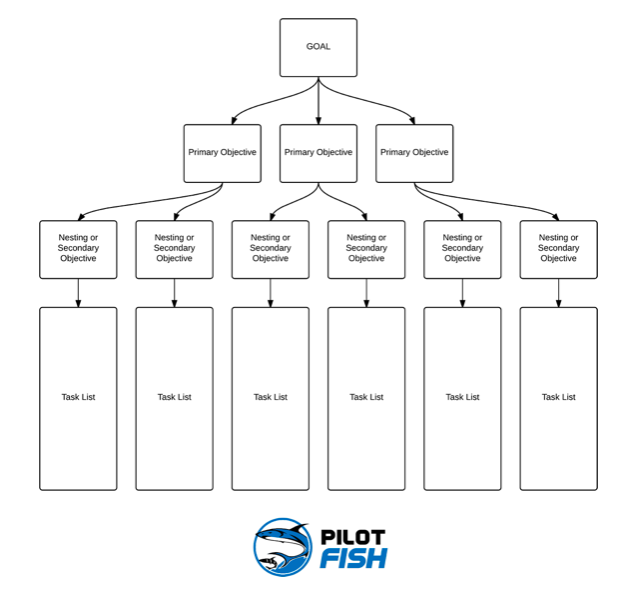 Start from your goal and begin working backward, breaking your goal into primary objectives. The primary objectives should support the goal. Then, work backward from those objectives and create nesting or secondary objectives. The nesting or secondary objectives should support the primary objectives. Finally, break the secondary or nesting objectives down into tasks. All of the objectives, primary, secondary, and tasks, should only be focused on one thing. In other words, you shouldn't have an objective that reads, “Increase Facebook advertising by 50% AND increase LinkedIn advertising by 30%.” Those should be separated into 2 separate objectives.